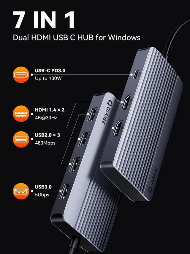 7-in-1 USB C Docking StationThis docking station with 2 hdmi ports equipped with 1*USB-A 3.0, 3*USB-A 2.0, 1*USB-C PD-IN port. This Laptop dock expands your workstation to vastly improve efficiency while working from home or office. Note: Ensure your USB-C port supports data, power delivery and display.