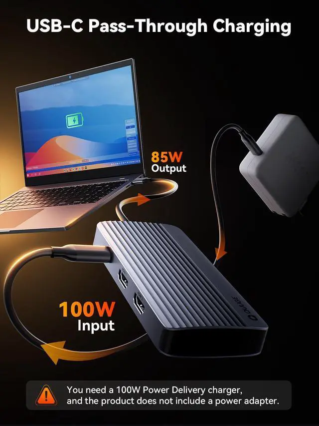 100W Fast ChargingThis docking station dual monitor with a USB-C power delivery port can quickly charge your laptop, reducing charging time and improving work efficiency. USB C Hub for multiple monitors input 100W, output 85W. Note: The power charger and charging cable are not included in the package.