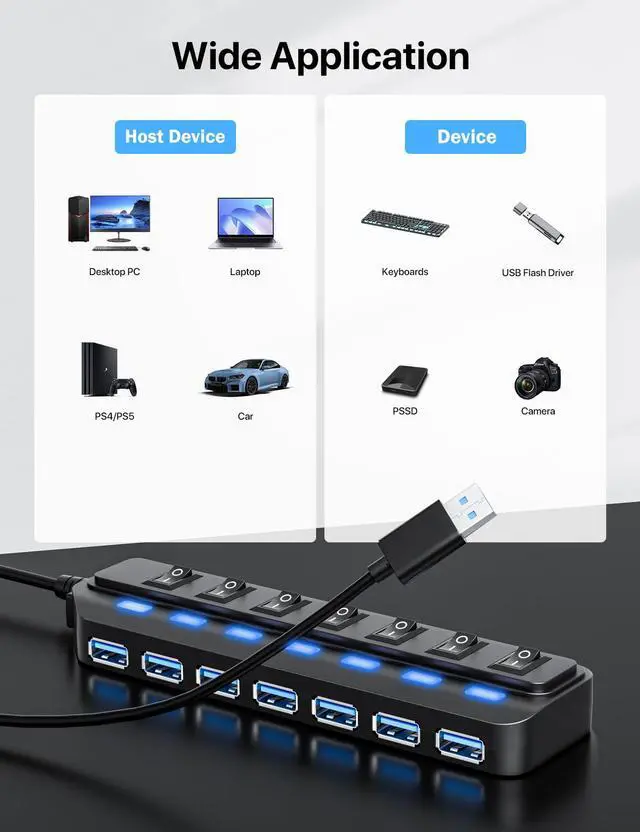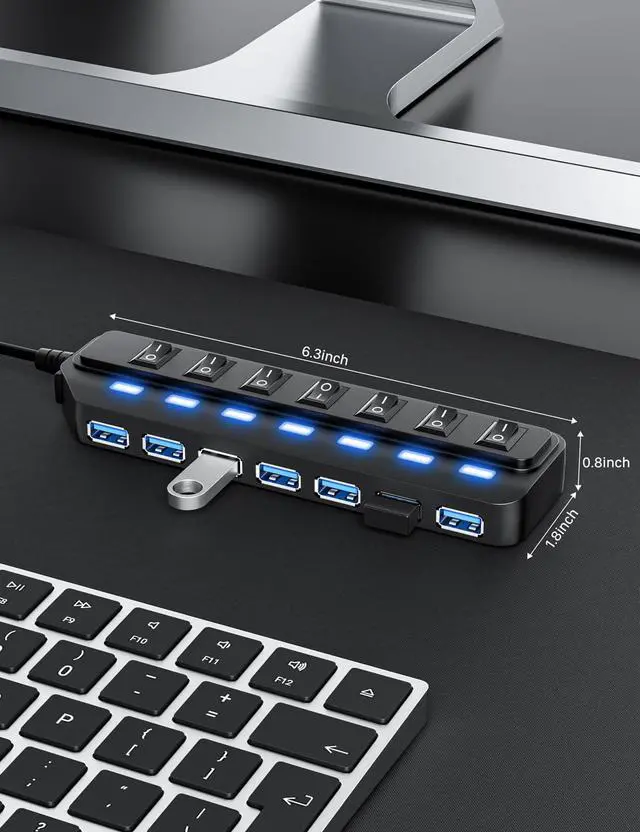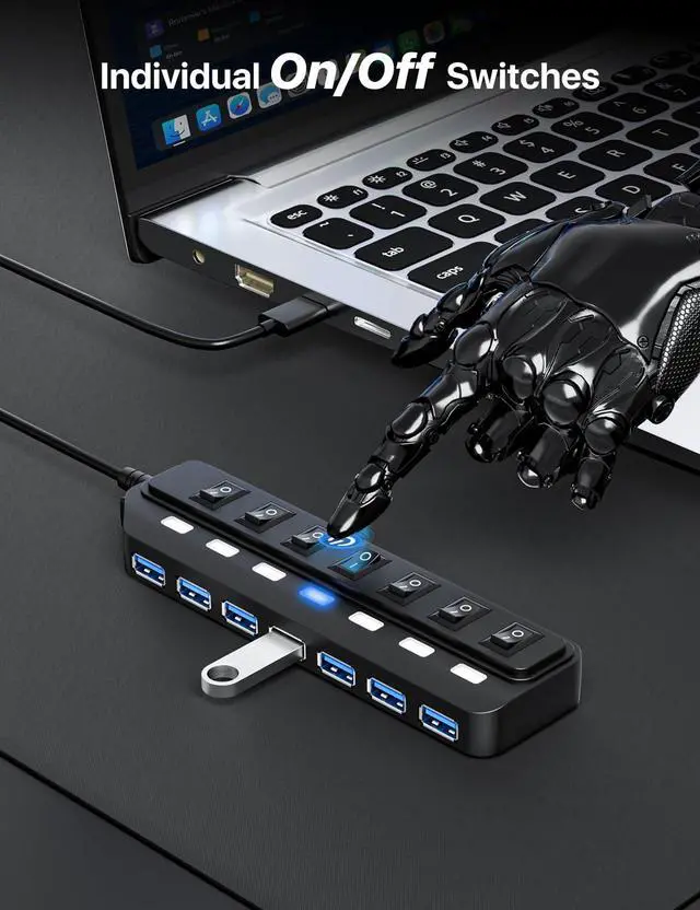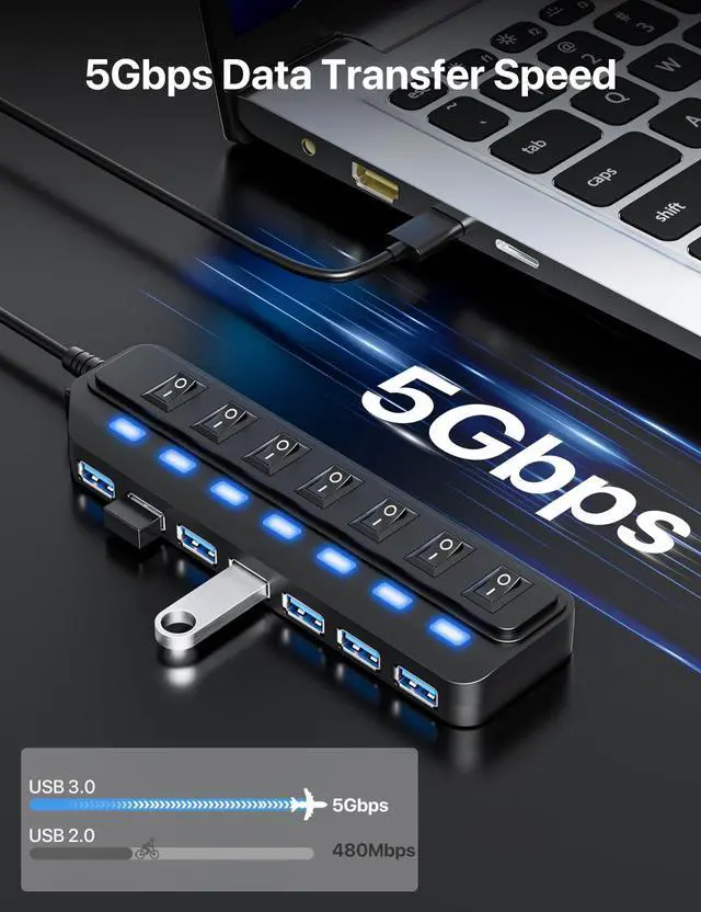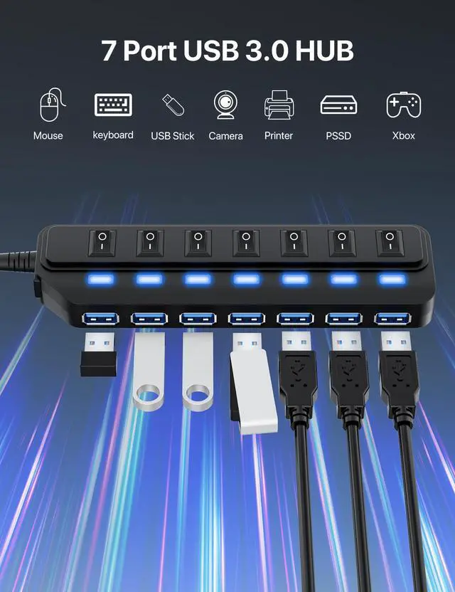 USB Hub 7 Port, USB 3.0 Hub Splitter with Individual On/Off LED Switches, USB Hub for PC, 5Gbps HighSpeed Data for Laptop, Mac, PC, Desktop, PS5, Xbox and More