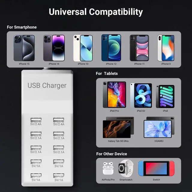 USB charging station, USB charger with 50W and 10 USB multi-ports (5V, 2.4A and 5V, 2.1A and 5V, 1A), can charge multiple devices at the same time, make your life better.