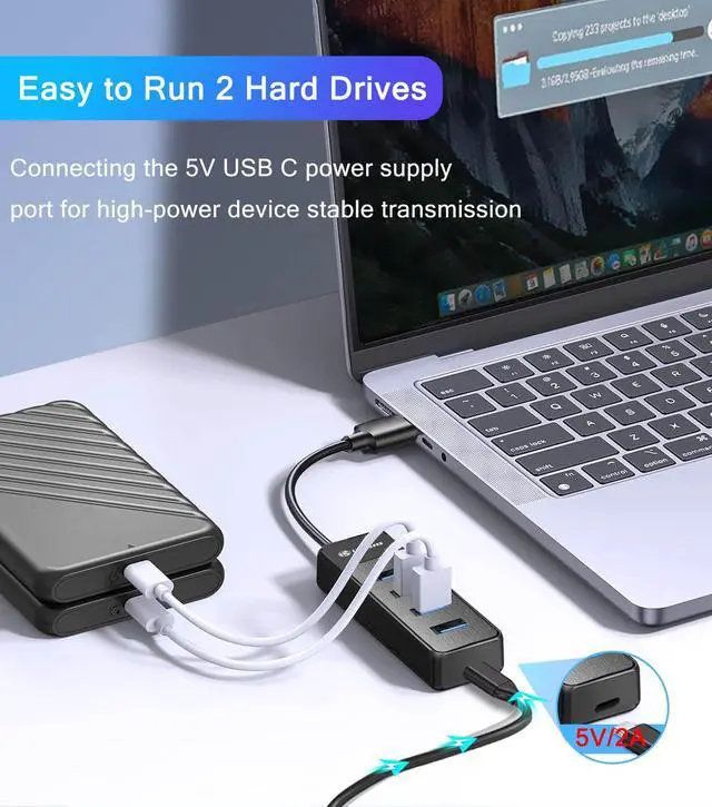 with USB-C Power Port: with 5V USB-C Power port. High-speed transfer of large-capacity data easily leads to insufficient power supply to the hub and slows down the transfer speed. Use the USB-C charging port to ensure transfer stability.