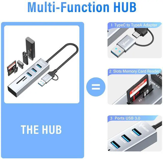 This USB hub adapter features 5 interfaces , including 3 USB 3.0 ports - turning one USB port into three, which is very suitable for connecting USB peripheral devices, and 2 slots for SD/SDHC/Micro SD/TF cards - making it easy to access files on memory cards. The design of anti loss Type-C to USB A adapter can be used to connect devices with different interfaces.
