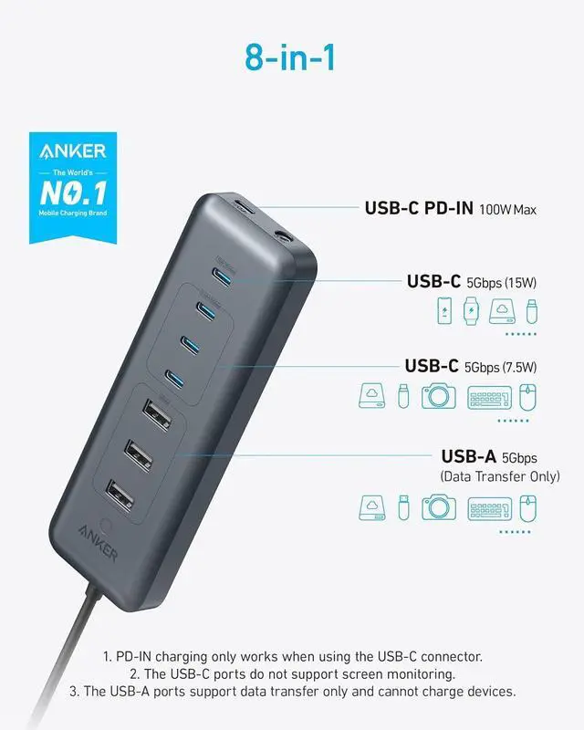 What You Get: Anker USB-C Data Hub (8-in-1 5Gbps) 45W power adapter safety sheet 18-month warranty and our friendly customer service.