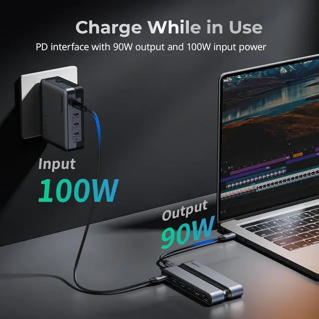 Fin-inspired Cooling Design: Unique fin-inspired design for efficient heat dissipation, ensuring safe and long-lasting operation. Note: It is normal that device surface temperature may rise when using multiple ports simultaneously.