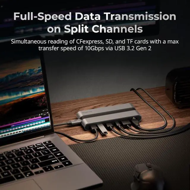 9-in-1 Multi-Function Ports: Equipped with 9 practical ports, including 1x 10Gbps CFexpress Type A slot, 1x UHS-II SD 4.0 and microSD 4.0 slot, 1x 10Gbps USB-C port, 2x 5Gbps USB-A ports, 1x 4K@30Hz for HDMI port, 1x Gigabit Ethernet port, and 1x 100W PD-IN port, supporting multiple devices simultaneously to improve work efficiency. Note: 1. Not available for Nintendo Switch. 2. Does not support XQD cards.
