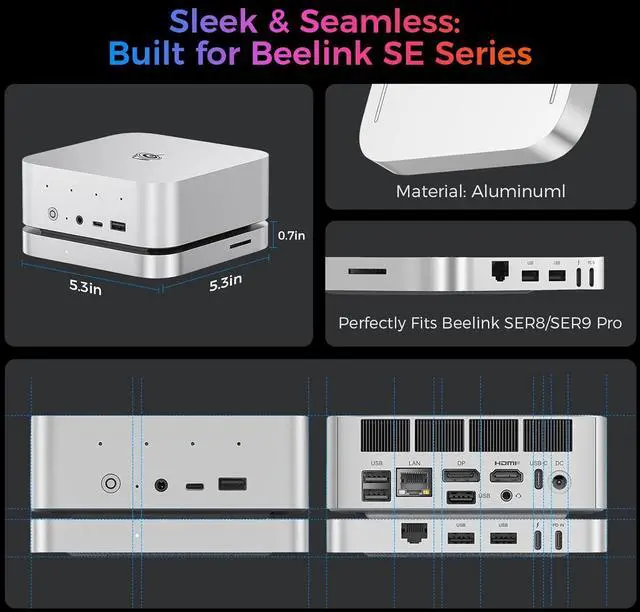 Precision Design for Beelink SE Series Mini PCs: Featuring a sleek aluminum alloy shell, the Mate SE-A seamlessly integrates with Beelink SER8/SER9 PRO. Its ultra-slim profile(5.315x5.315x0.709in) and minimalist design create a space-saving setup