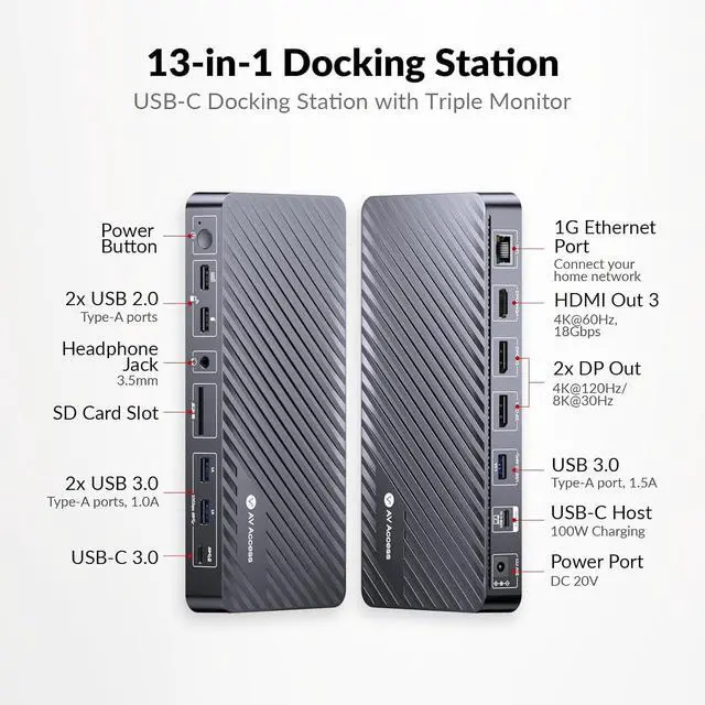 13-in-1 Connectivity & Stable NetworkExpand your setup with HDMI, DisplayPort, USB 3.0/2.0, USB-C (data), SD card slot, Gigabit Ethernet, and audio ports. Enjoy stable Ethernet connectivity, fast SD transfers, and seamless audio support for home, office, or professional multi-monitor environments.