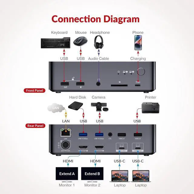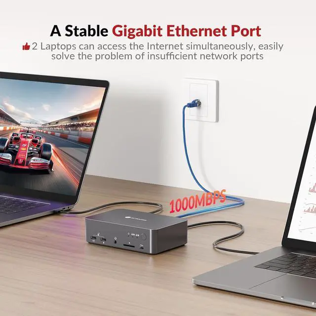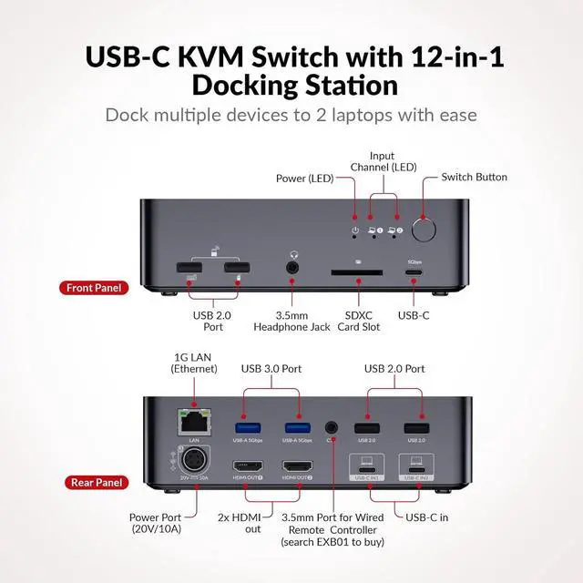 Powerful 12-in-1 Docking StationUnleash the potential of this KVM switch for 2 laptops with multiple shared peripheral ports, like 2x USB 3.0, 4x USB 2.0, 1x USB-C, 1x 1G Ethernet, 1x 3.5mm headset, 1x SD card slot, and 2x HDMI outputs. Easier than ever to create a powerful workstation at home.