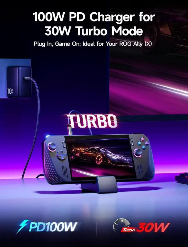 Included 100W PD Charger: Supports full-speed charging for major handheld consoles. Charging limits follow each devices max input: Steam Deck (up to 45W), ROG Ally / Ally X (up to 65W), and Legion Go (up to 65W). Fully supports ROG Ally / Ally Xs 30W Turbo Mode
