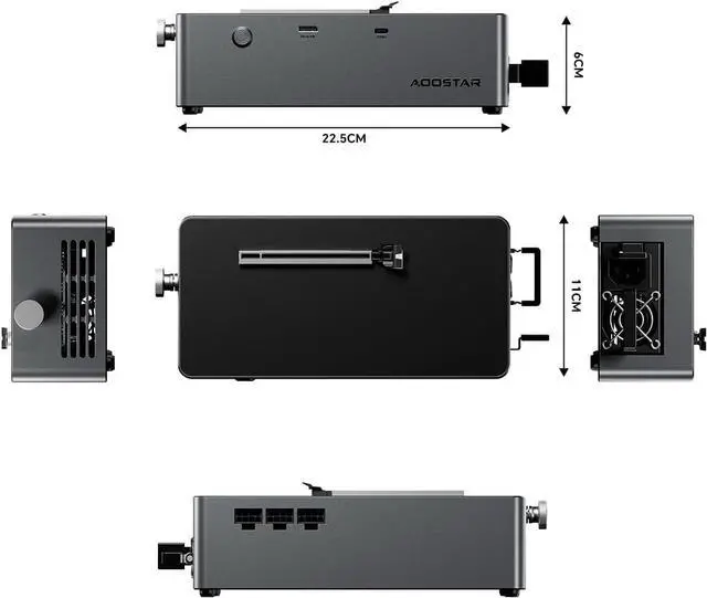 AOOSTAR AG02 EGPU Dock The AOOSTAR AG02 external GPU docking station has a built-in 800W power supply. The maximum power consumption of the GPU is 600W, so it basically meets the needs of most existing graphics cards. AG02 eGPU dock adopts an open metal body design with aluminum profile center frame, size 22.5 x 11 x 6cm, weight 1.5KG, and unlimited graphics card length.