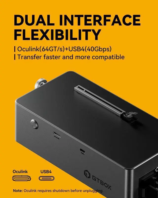 GTBOX eGPU Enclosurespecifications Interface: 1xOCuLink+USB4 interface, 3x8-pin graphics card power connector. Power input: AC 220V~ 50/60Hz. OS: Supports both Mac and Windows (Win11 22h2 or higher version recommended).