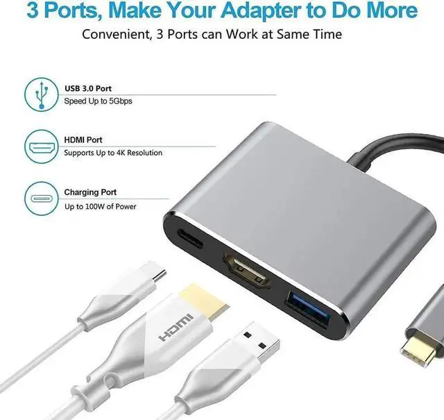? USB C 3-in-1 Adapter? This USB C HUB expands the USB C interface device into an HDMI port, a USB 3.0 port and a USB-C 3.1 port, compatible with USB C interface of all computer systems. Supports USC C port for all laptops, tablets and mobile devices.