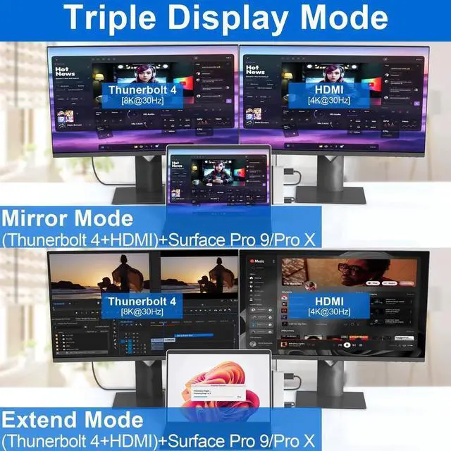 Triple Video display ( 4K HDMI + USB-C Thunerbolt 4 ) + Surface Pro 9/Pro 10/Pro 11/Pro X modes Boost your efficiency 3 times.