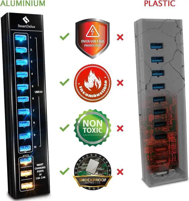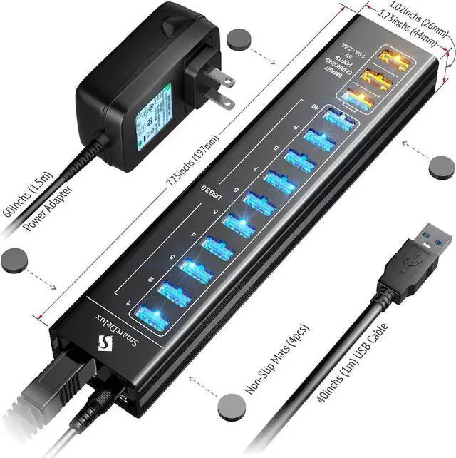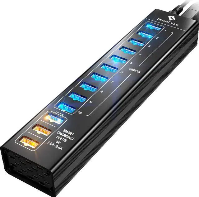 SmartDelux Powered USB Hub - 13-Port USB 3.0 Hub with 10 USB 3.0 Ports, 3 Smart Charging Ports, Power Adapter, Long Cord, LEDs - Black Aluminum
