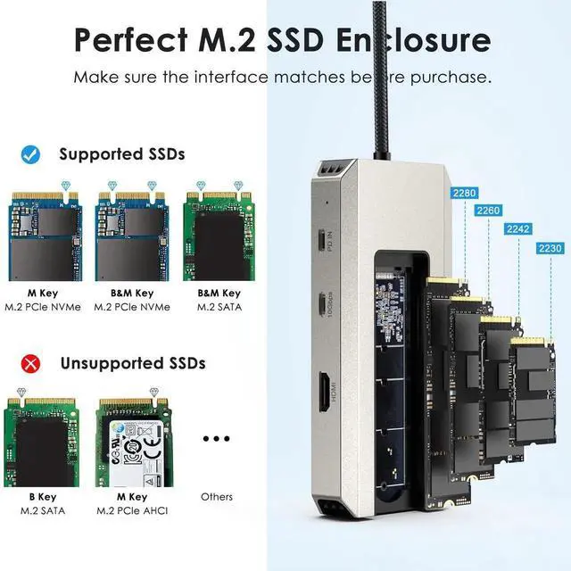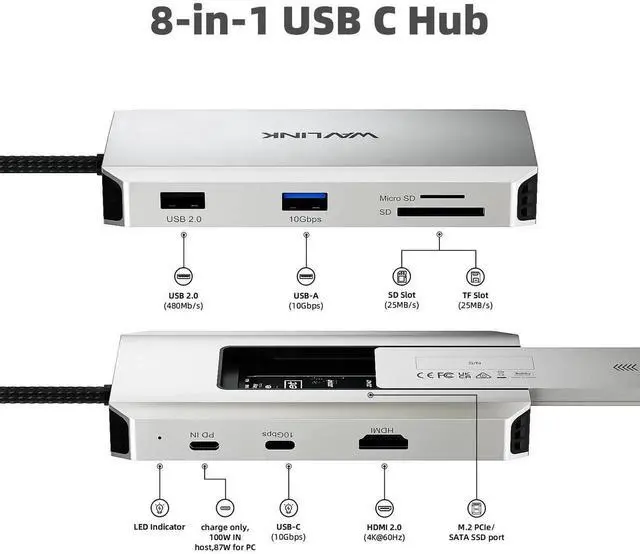 WAVLINK 8 in 1 USB C Hub with M. 2 NVMe/SATA SSD Enclosure 10Gbps, 4K HDMI, USB-C/A 10Gb, 100W PD, Aluminum Alloy USB C SSD Enclosure for M. 2 NVMe SATA SSD forM1/M2/M3/M4 macOS Systems