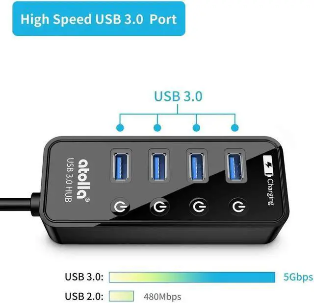 SuperSpeed Syncing and Smart Charging- atolla USB 3.0 hub can expand 1 USB 3.0 port to 4 extra USB 3.0 data ports for hard drives, flash drives among other USB devices, syncing data at blazing speeds up to 5Gbps. A charging port can provide up to 2.4Amps to charge your iPad, iPhone, etc.