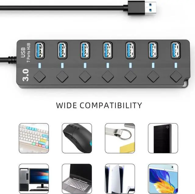 Usb hub Long cable: as long as 3ft length build in import cable enhanced connectivity to hub body dispel your concerns for too short to connect to your pc/tablet. Compact & PortableIt's very easy to use just plug and play. Light weight make it easy to carry and suitable for your travel office home and school. 5Gbps Data Transfer SpeedThis USB hub 3.0 syncs data at blazing speeds up to 5Gbps which is more than 10 times faster than USB 2.0 fast enough to transfer an HD movie in seconds.