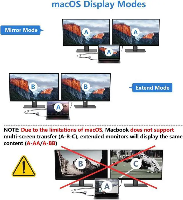 **Please make sure your device's USB-C port supports video transmission because some devices' USB-C ports only support charging or data transfer. macOS devices do not support MST mode when connecting two monitors 2 monitors can only display the same content**HDMI Adapter for Dual Monitors This dual hdmi usb c adapter extend your laptops usb c port into 2 hdmi ports 4K@60Hz convenient for you to share the contents of your laptop to 2 external monitors greatly improves your work efficiency. It is an ideal usb c accessories for programmer data analysts photographer etc. Crystal Clear Dual 4K Video OutputUSB C to HDMI adapter allows you to display the content of your laptop to 2 monitors at the same time at 3840*2160@30Hz.