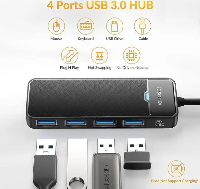 4-Port USB 3.0 HubiDsonix USB 3.0 hub can easily expand one USB C port of a computer to 4 USB A ports and is allowed 4 ports simultaneously use. Compatible with USB Flash Drive Mouse Keyboard or any other USB devices.
