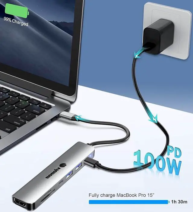 7-in-1 USB C HubThis USB C adapter with 1 HDMI port 1 PD 100W charging port 2 USB 3.0 port and Memory SD/Micro SD Card slots accommodating a variety of devices. Clear Visual EnjoymentMirror or extend your screens to a projector or monitor with a resolution up to 4K@30Hz via HDMI port ideal for conference presentations games or home theaters with excellent visual experience(Note: Before Your Puchase Please confirm the USB-C Port of your host supports DP ALT mode / video output). Hyper Transmission SpeedThe USB 3.0 port offers transfer speed up to 5Gbps which enables you to access files within seconds; SD and TF card slots support secure reading and writing speed for browsing photos instantlySuper-fast ChargingThe 100W PD port provides a continuous charging speed to your computers at up to 100W without occupying the scanty ports make sure you transfer files or streaming media smoothlyUniversal SD/TF Ready SD card or Micro SD card can be used at a fast transfer speed up to 104M/S capacity up to 512GB easy to transfer photos shooting or videos by your camera from cards to laptop in just seconds. This USB - C dongle can also charge your MacBook or other Type-C devices in office or meeting rooms.