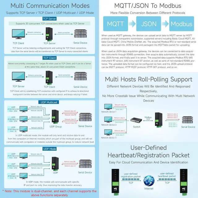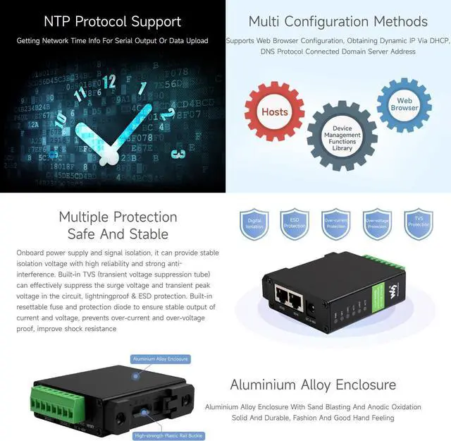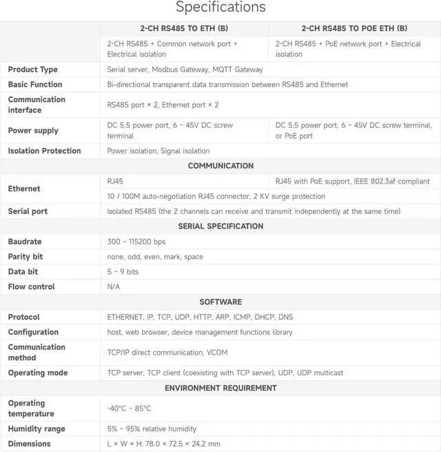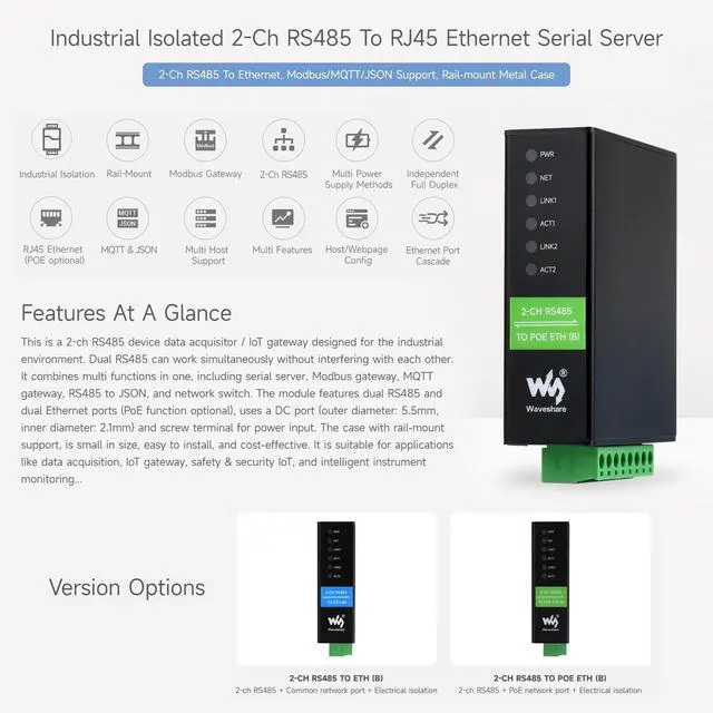 2-Ch RS485 To RJ45 Ethernet Serial Server, Dual Channels RS485 Independent Operation, Dual Ethernet Ports,Rail-Mount Industrial Isolated Serial Module Features At A Glance