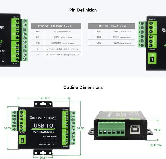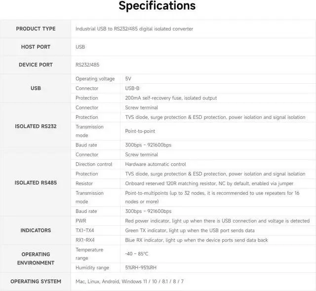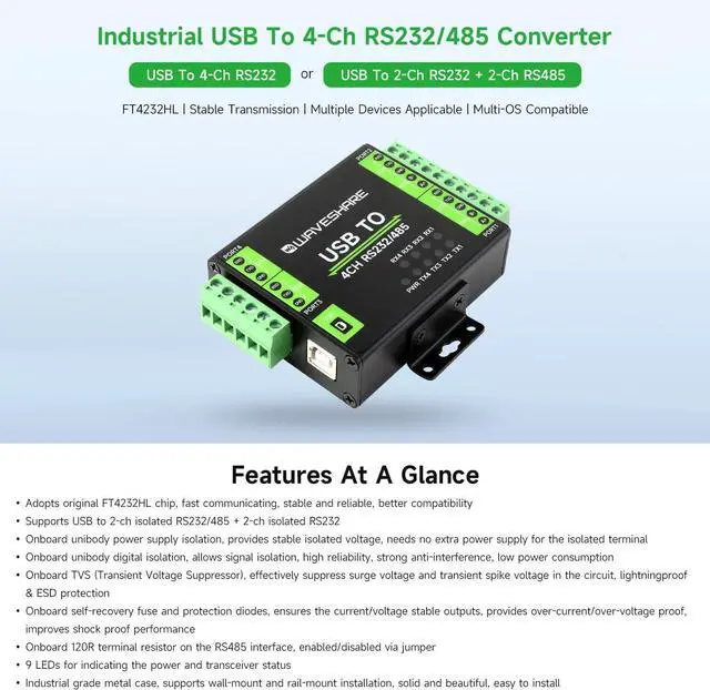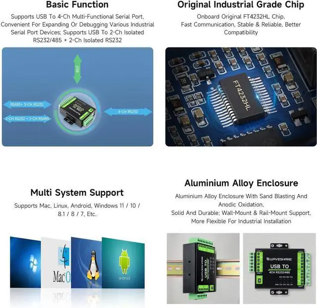 Adopts original FT4232HL chip, fast communicating, stable and reliable, better compatibility. Supports USB to 2-ch isolated RS232/485 + 2-ch isolated RS232