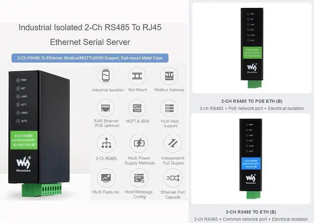 2-Ch RS485 To Ethernet, bi-directional transparent data transmission between RS485 and Ethernet. Dual RS485 can work simultaneously without interfering with each other. Rail-mount support. Modbus gateway support, suitable for Modbus networking upgrade, Can be used with specific configuration software.