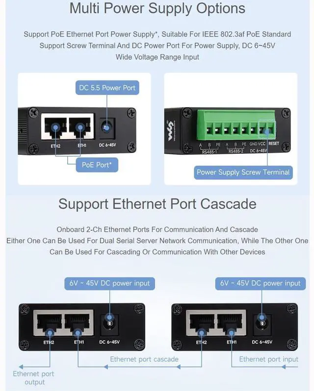 Multi Power Supply Options, Support PoE Ethernet port power supply*, Suitable for IEEE 802.3af PoE standard, Support Screw Terminal and DC Power Port for Power Supply, DC 6~45V. Wide Voltage Range Input.