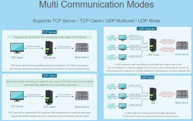 Multi communication modes, supports TCP server / TCP client / UDP multicast / UDP mode. Multi hosts roll-polling support,different network devices will be identified and responsed respectively, no more crosstalk issue while communicating with multi network devices.