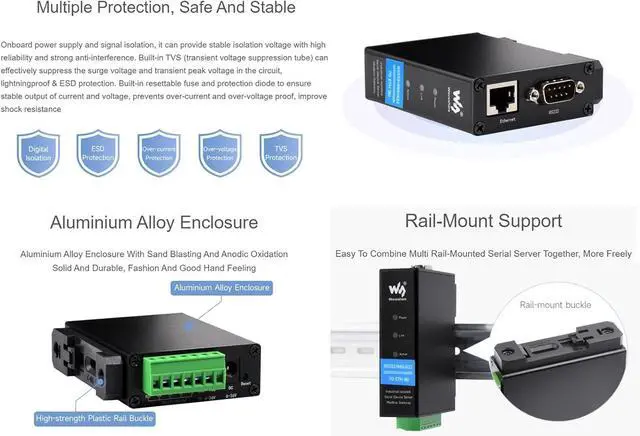 RS232/485/422 serial server, support Modbus Gateway, suitable for Modbus networking upgrade, can be used with specific configuration software, support TCP server / TCP client / UDP mode / UDP multicast multi communication modes, support MQTT/JSON to Modbus, more flexible conversion between different protocols