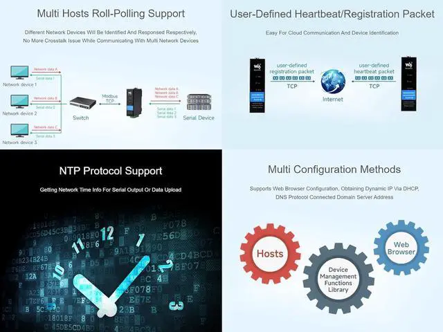 Support Multi hosts roll-polling, user-defined heartbeat/registration packet, NTP protocol, Multi configuration methods