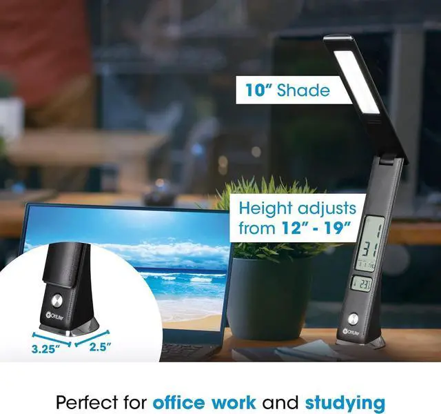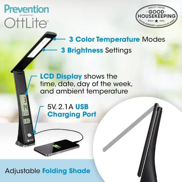 Features an alarm and shows the date, day of the week, time, and ambient temperature