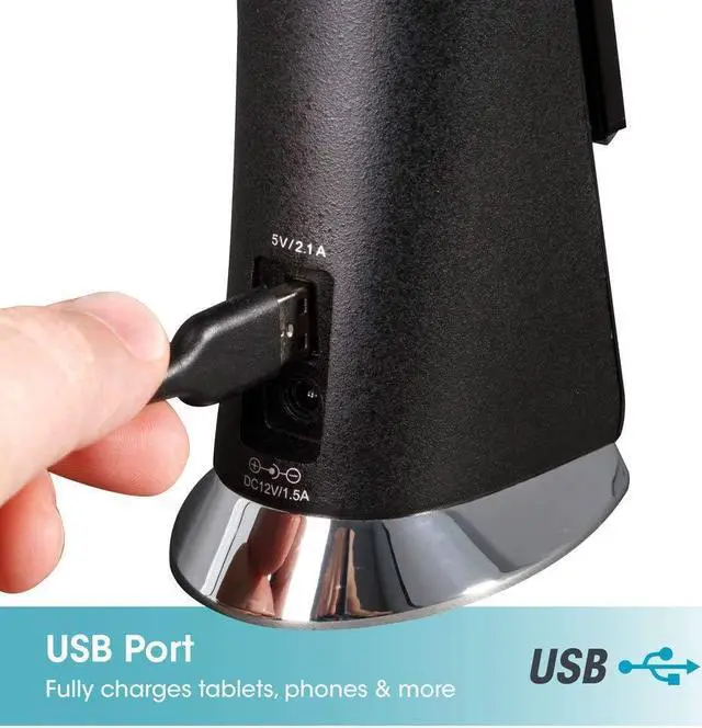 5V, 2.1A port fully charges smartphones, tablets, and more