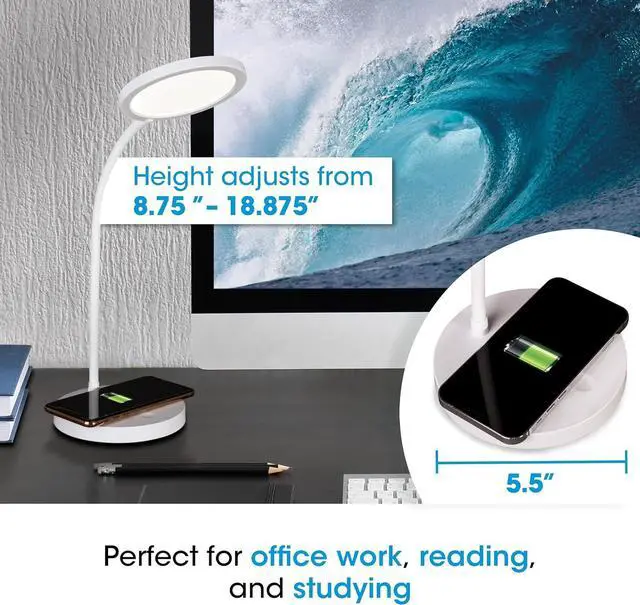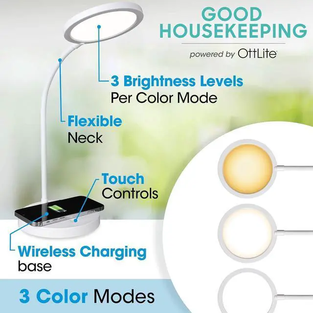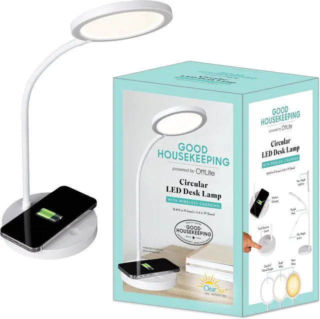 BACKED BY THE GOOD HOUSEKEEPING SEAL: Good Housekeeping by OttLite Circular OttLite LED Desk Lamp with Wireless Charging is great for office work, studying, and more. This lamp is part of a line created with Good Housekeeping magazine and has earned the Good Housekeeping Seal. The shade adjusts height up to 18.75 inches. The base measures 5.5 inches.