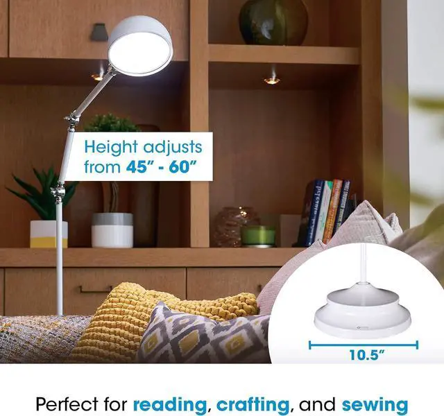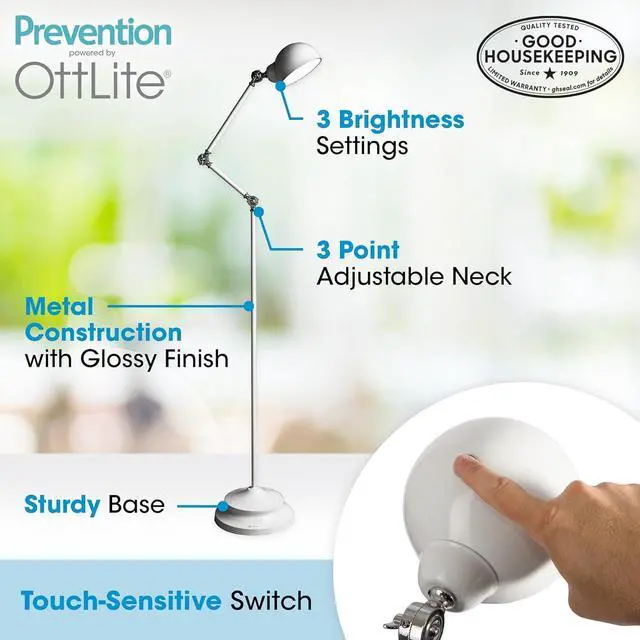 Backed by the Good Housekeeping Seal: Prevention by OttLite LED Pharmacy Floor Lamp is great for hours of reading, crafting, and sewing. This metal lamp with a glossy finish is part of a line created with Prevention Magazine and has earned the Good Housekeeping Seal. The height adjusts from 45 to 60 inches, and the base diameter measures 10.5 inches.