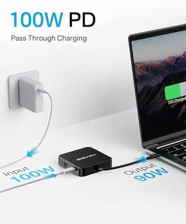 ACASIS 6 IN 1 10Gbps Type C to HDMI AdapterWith 4K 60Hz HDMI, 3 USB A 3.1, 1 USB C 3.1, and PD 100W USB C charging port, this usb c adapter supports data transfer, display expansion, charging, basically meet different ports needs. Notemake sure your computer type c port can support video transmission( USB 4.0 /Thouderbolt 3/Thouderbolt 3 can support)