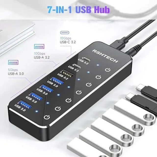 Hybrid USB Port Expander: RSHTECH 7 Ports USB Hub instantly adds 10Gbps USB-A 3.2 port, 2 USB-C 3.2 ports, and 4 USB-A 3.0 Ports extensions to your laptop, PC and more. Plug-and-play, no driver required, easily solve the problem of insufficient ports and keep your desk clutter-free