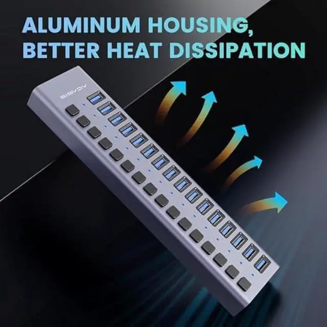 90W Powered USB Hub - ACASIS 16 Ports USB 3.0 Data Port, Aluminum Housing, Individual On/Off Switches, 12V/7.5A Power Adapter, USB Splitter for Laptop, PC, Computer, Printer