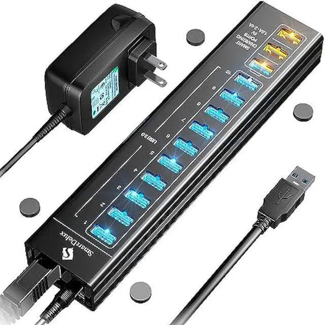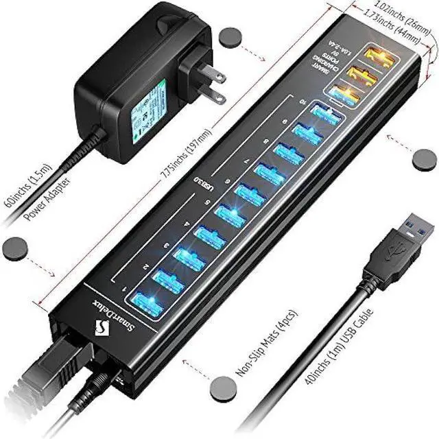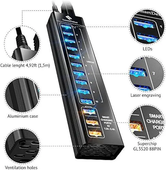 10 HIGH-SPEED USB 3.0 PORTS of the USB 3 Hub give you the opportunity to simultaneously connect a lot of USB peripherals or devices and allow to transfer data with speed up to 5 Gbps