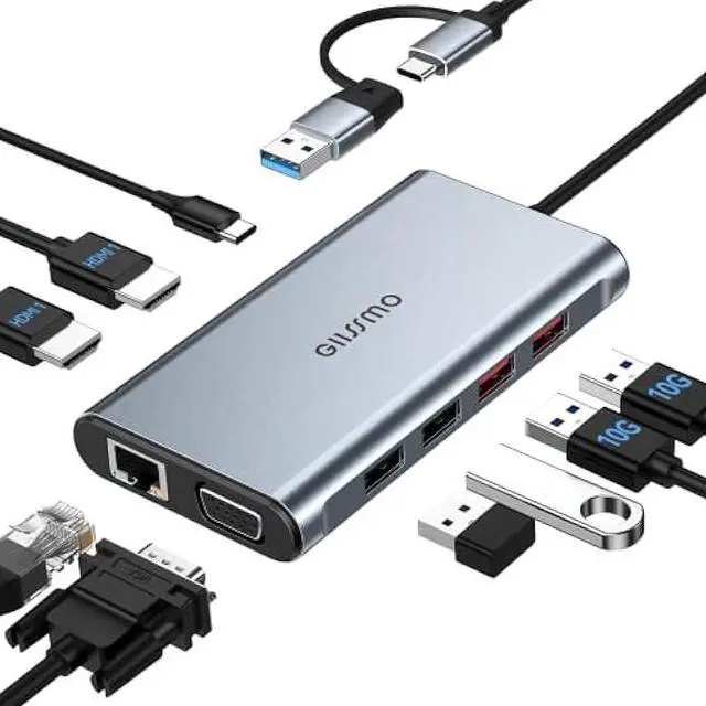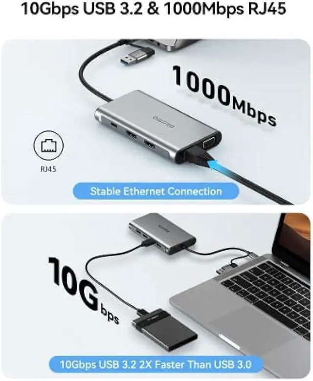 9 IN 1 USB C Docking Station: Convert your USB-C /USB-A port into 2 HDMI ports, 1 VGA port, 2 USB 3.1 ports, 2 USB 2.0 ports, and 1 USB charging port. Our dual monitor docking station expands your work opportunities and provides you with more stable performance. (The USB-C charging port is only designed for our USB docking station charging (not support charging for laptops) (NOTE: download the driver Siliconmotion before using the docking station)