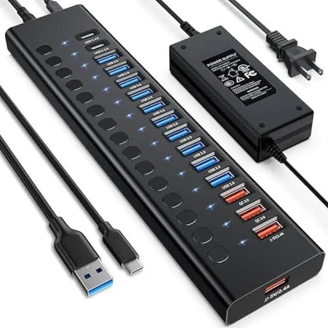 Hub: The AGEEN Powered USB Hub is equipped with 10 USB-A 3.0 ports, 2 Quick Charging (QC 3.0 ) ports, 2 USB-A Smart Charging ports, and 2 USB-C 3.0 data transfer ports. The QC 3.0 ports deliver 24W power, while the Smart Charging ports provide 5V/ 2.4A power, ideal for charging smartphones, tablets, earbuds, smartwatches, and other compatible devices.
