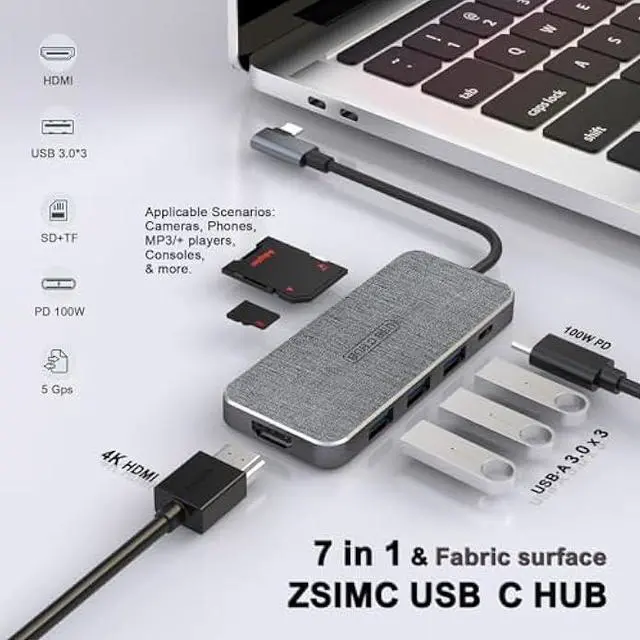 7-in-1 USB C AdapterExpand more ports to connect more. ZSIMC USB C Hub features a 4K HDMI (3840x2160) output port, SD and TF card readers, 1 Type C PD- 3.0 100W charging port and 3 USB A 3.0 Gen 1 (5Gbps) ports. All hub ports can work simultaneously and save you the trouble of plugging & unplugging repeatedly, allows you to keep a sleek workspace. The USB C Adapter has perfectly combined all the functions you need.