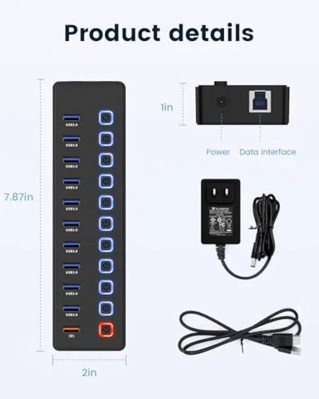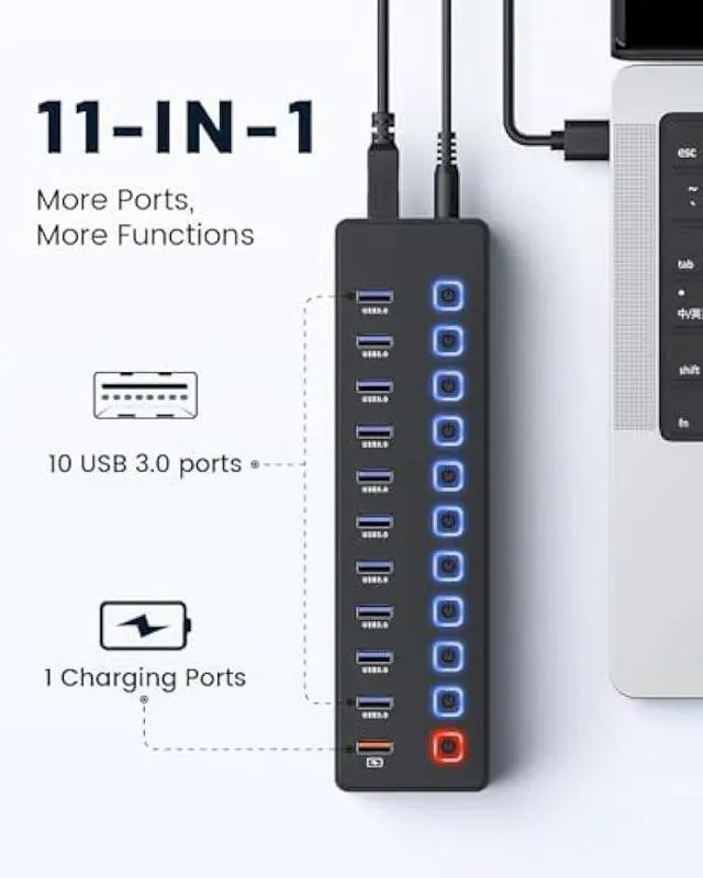 11-port hub distributor, multi-port expansionusb hub for laptop can expand a single Usb port to 10 Usb 3.0 ports and 1 Usb smart charging port, and is equipped with a 100 cm ( 3.3 ft) long Usb cable and power adapter, and the power cord is 120 cm (4 ft) long. Usb hub is an ideal data backup and transmission solution for home and office