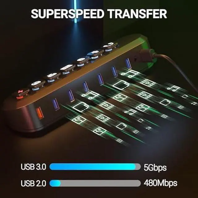 • Light Up Your Control7-port USB 3.0 hub with illuminated icon switches to easily toggle between connected devices, such as mic, headphones, hard drive, keyboard, mouse, and more