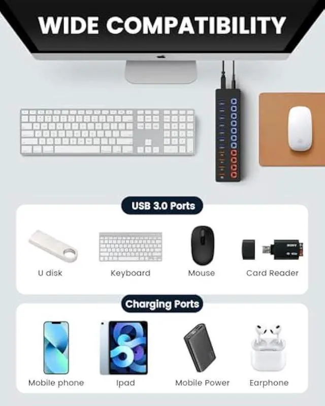 Fast file transferThis powered usb hub supports high-speed data transfer speed of up to 5Gbps, which can quickly transfer files and improve work efficiency