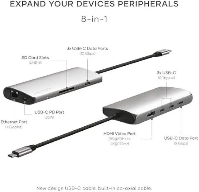8-in-1 Connectivity - Featuring an Ethernet, 1 HDMI port, 1 USB C PD charging capable of delivering up to 100W, and Micro/SD Card Readers (UHS-I) for quick data transfers, 3 USB 3.2 ports up to 10 Gbps, 1 USB 3.2 port up to 5 Gbps. An all-in-one solution for all connectivity needs