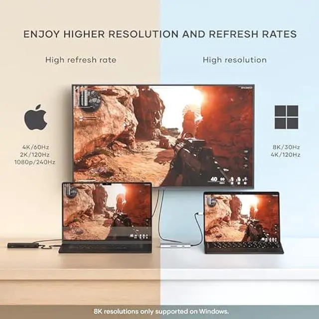 Enhanced Display - Immerse yourself in stunning visuals from a docking station with resolutions up to 8K @ 30Hz and high refresh rates including 4K @ 120Hz, 2K @ 144Hz, and 1080p @ 240Hz, catering to both gamers, creators, and professionals