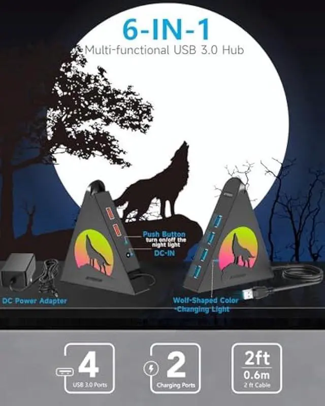 Eye-Catching RGB Wolf Design This vertical USB hub features a glowing howling wolf icon with vibrant multicolor lighting, adding a cool ambient glow to your desktop. Perfect for gamers, streamers, and creative pros who want both function and style. Easily control the night light by pressing the side button once to turn it on or off, customizing your workspace atmosphere.