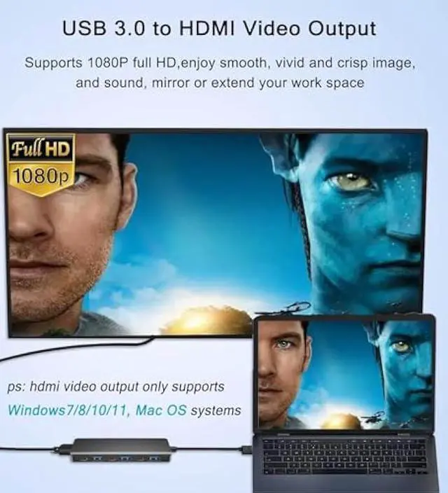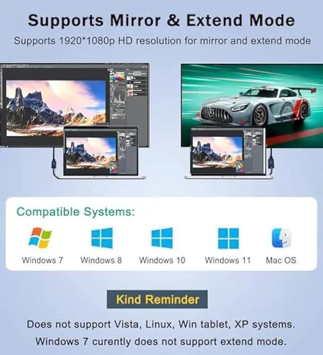 HDMI: This USB 3.0 to HDMI adapter is used to connected USB device(computer, laptop, desktop) with HDMI devices (monitor, projector, TV) for multi-monitor solution. Supports Mirror mode and extend mode with 1920*1080 HD resolution image, compatible with Windows 7/8/10 and Mac OS system (Windows 7 NOT support extend mode currently).