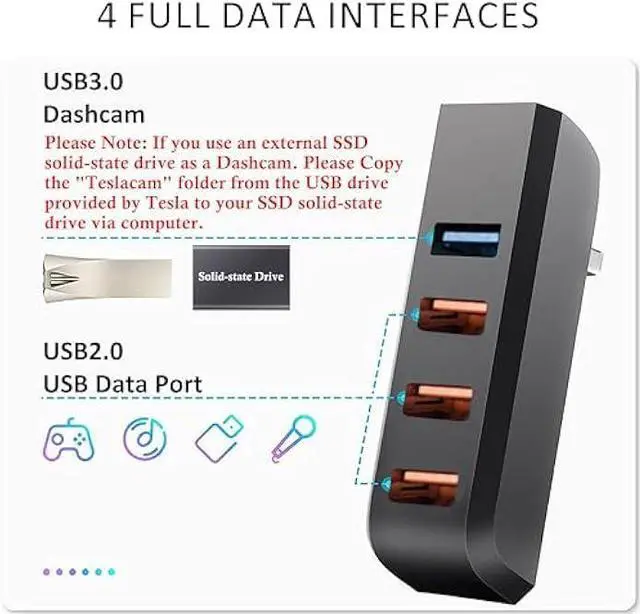 4-in-1 Multi PortsConvert the original car from one glove box USB-A port to four USB-A ports. One USB 3.0 port and three USB 2.0 ports. The USB 3.0 blue port is suitable for driving recorders. It is compatible with external Dashcam and supports the use of up to 2TB SSD solid-state drives. The other three 2.0 interfaces are suitable for charging, listening to music, playing games, and flash drives, and can be used simultaneously without worrying about car system alarms.